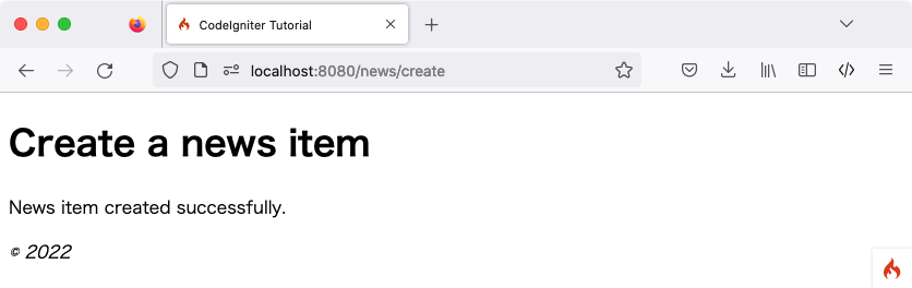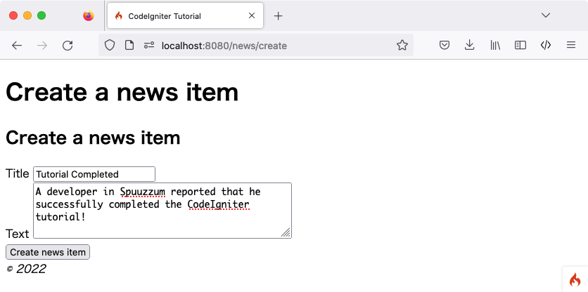 Now point your browser to your local development environment where you installed CodeIgniter and add /news/create to the URL. Add some news and check out the different pages you made.